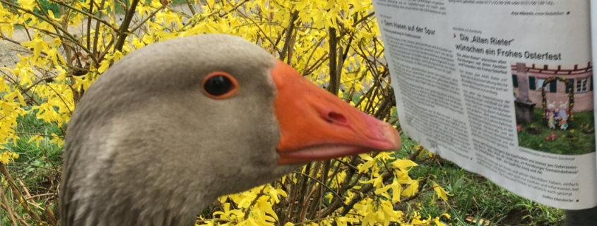 Unser Herr Flauschi ist begeistert: er ist ein Medienstar! Beim Besuch einer Redakteurin des Meier Magazins letzte Woche hat er stolz die Eier seiner seit kurzem brütenden Frau Flauschi präsentiert und sich auch bei der Magazinlektüre fotografieren lassen. Damit hat er sich recht erfolgreich in einen Osterartikel rund ums Thema Ei und unseren Nachbar-Betrieb Holzhobelhof reingenervt. Regelrecht um den Finger gewickelt hat er die Journalistin, der Schlingel! Und dabei den fleißigen Hühnerdamen von nebenan mitten in der Eierlegsaison vor Ostern die Show gestohlen. Nun betrachtet er stolz die Fotostrecke – und plant schon mal seine Medienkarriere. Doch lest selbst im Meier Magazin nach!
